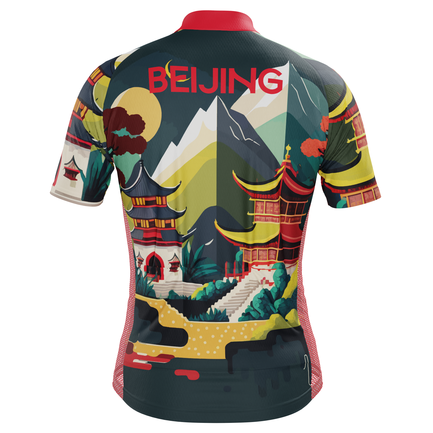 The Men's Around The World - Beijing Short Sleeve Cycling Jersey features a moisture-wicking LEMBO 140 GSM polyester, cooling 110GSM mesh side panels, and reinforced stitched back pockets.