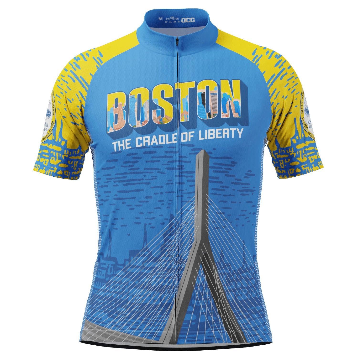 The Men's Boston Short Sleeve Cycling Jersey features a moisture-wicking LEMBO 140 GSM polyester, cooling 110GSM mesh side panels, and reinforced stitched back pockets.