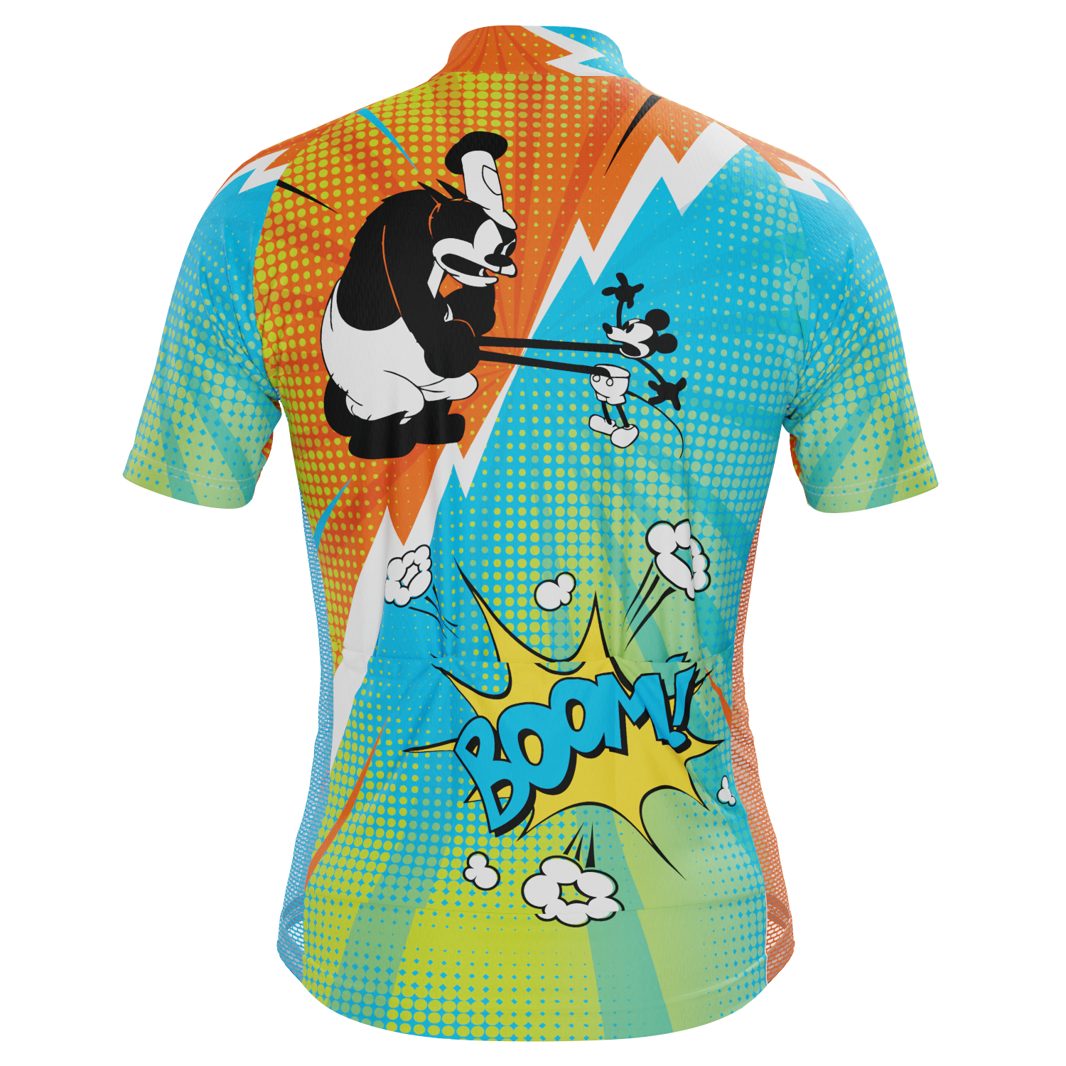 The Men's Steamboat Willie Comics Short Sleeve Cycling Jersey features a moisture-wicking LEMBO 140 GSM polyester, cooling 110GSM mesh side panels, and reinforced stitched back pockets.