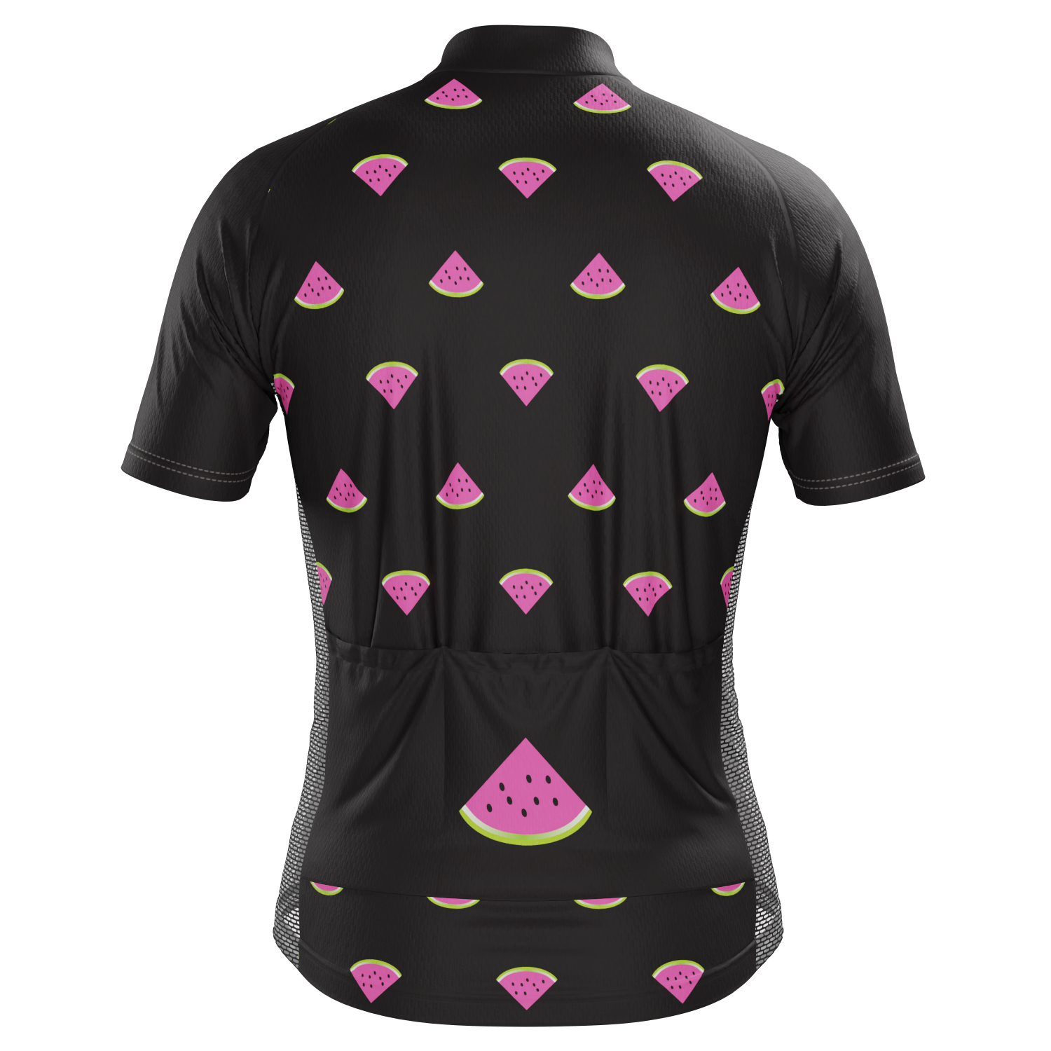 The Men's Watermelon Black Short Sleeve Cycling Jersey features a moisture-wicking LEMBO 140 GSM polyester, cooling 110GSM mesh side panels, and reinforced stitched back pockets.
