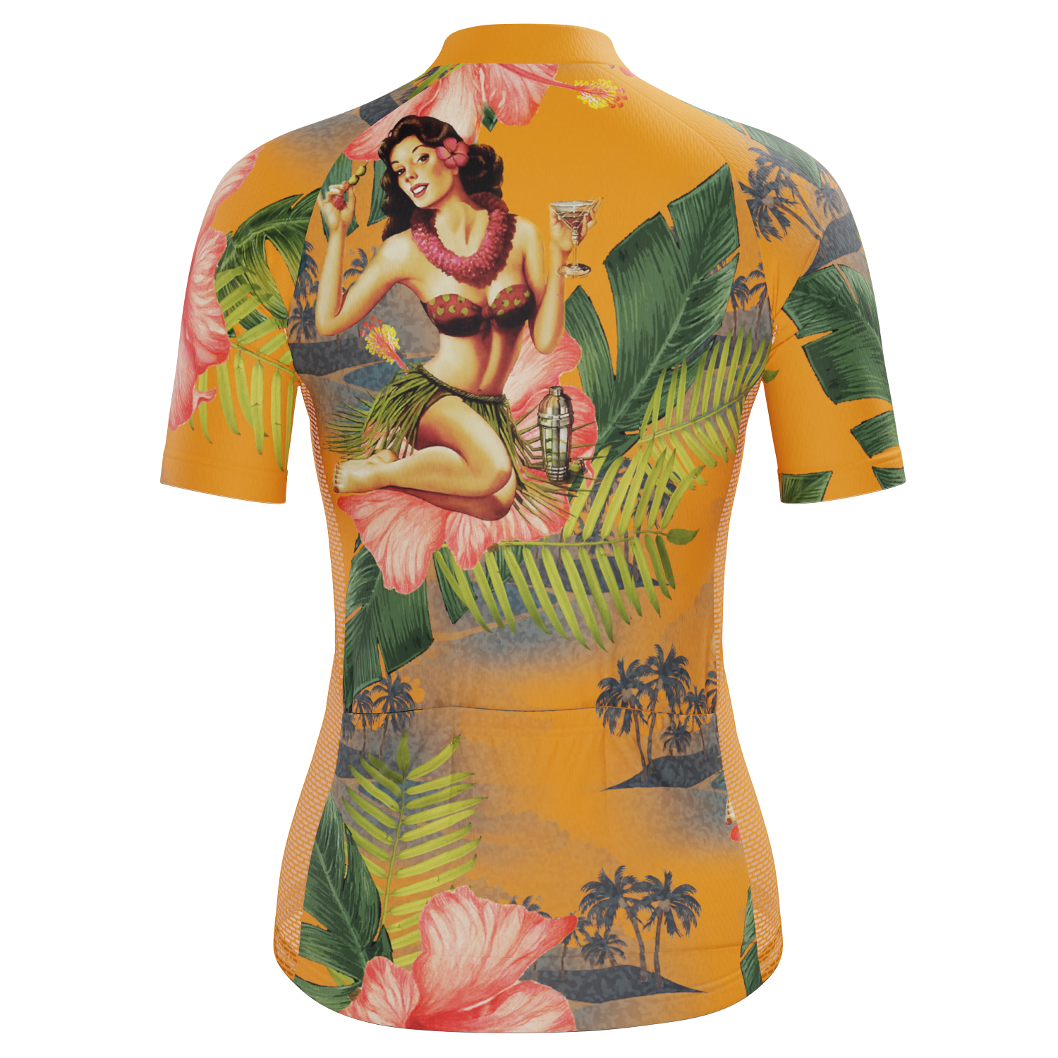 The Women's Aloha Flowers Short Sleeve Cycling Jersey features a moisture-wicking LEMBO 140 GSM polyester, cooling 110GSM mesh side panels, and reinforced stitched back pockets.