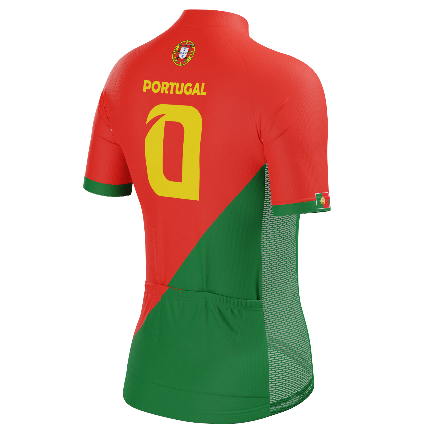 The Women's Portugal Soccer Short Sleeve Cycling Jersey features a moisture-wicking LEMBO 140 GSM polyester, cooling 110GSM mesh side panels, and reinforced stitched back pockets.
