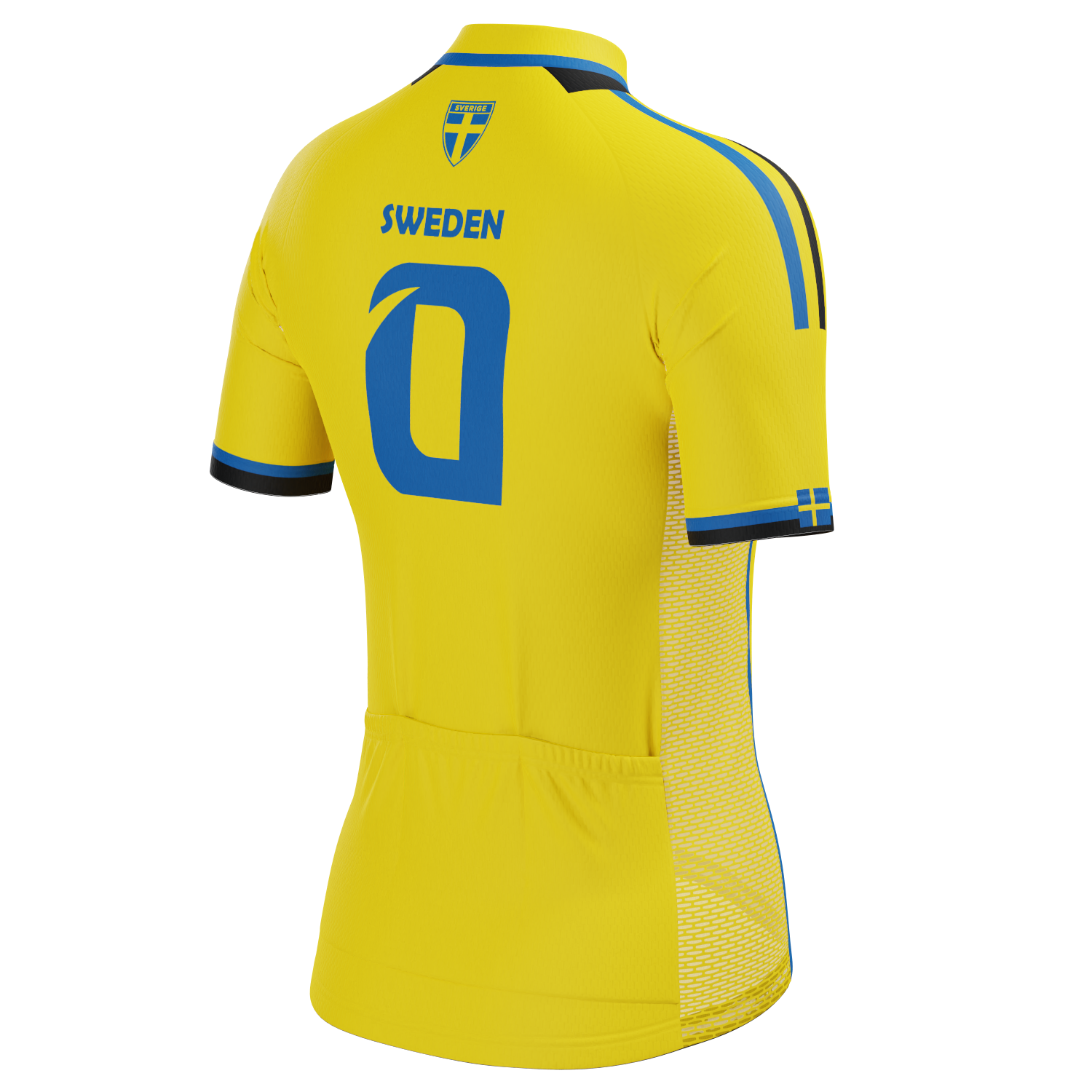The Women's Sweden Soccer Short Sleeve Cycling Jersey features a moisture-wicking LEMBO 140 GSM polyester, cooling 110GSM mesh side panels, and reinforced stitched back pockets.